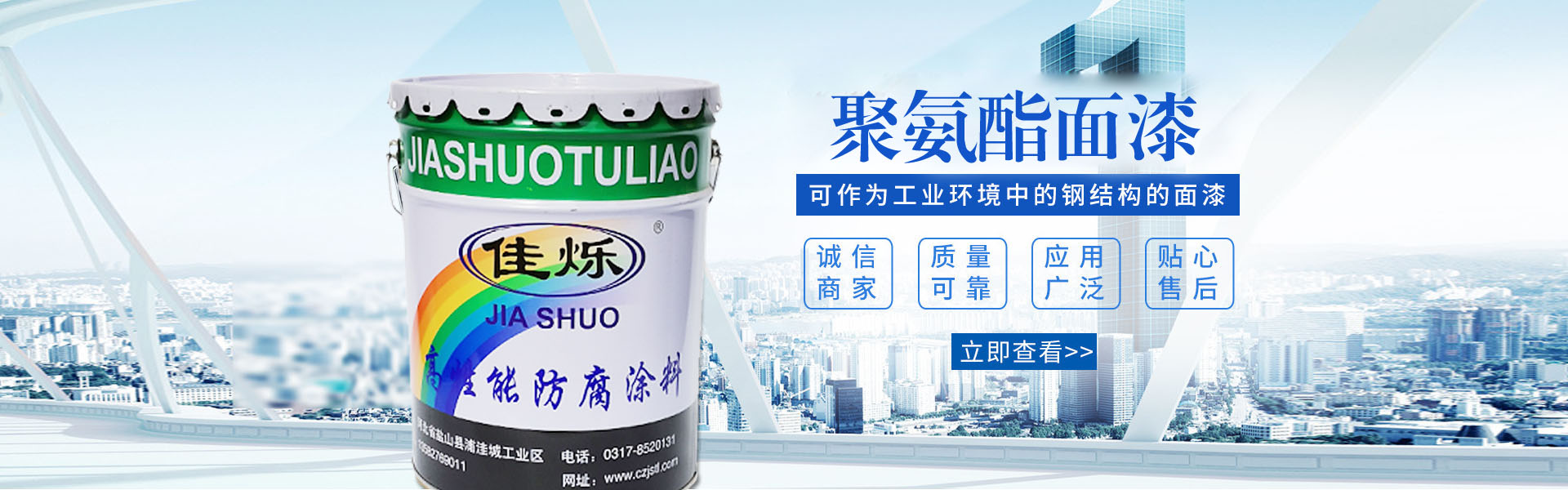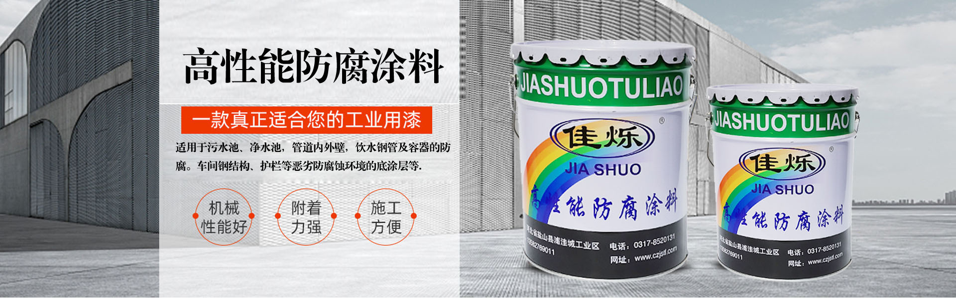 滄州嘉勝涂料有限公司是華北一家新型防腐涂料專業(yè)生產(chǎn)企業(yè)。我公司位于河北省滄州市鹽山開發(fā)區(qū)注冊(cè)資金1000萬元人民幣,占地面積18000平米,是一家具有2萬噸年生產(chǎn)能力的現(xiàn)代化企業(yè)。我公司憑借著強(qiáng)大的技術(shù)力量、完善、優(yōu)質(zhì)的售后服務(wù)及優(yōu)越的產(chǎn)品、合理的價(jià)格贏得廣大新老客戶的信任與好評(píng),現(xiàn)已在華北地區(qū)享有盛名!